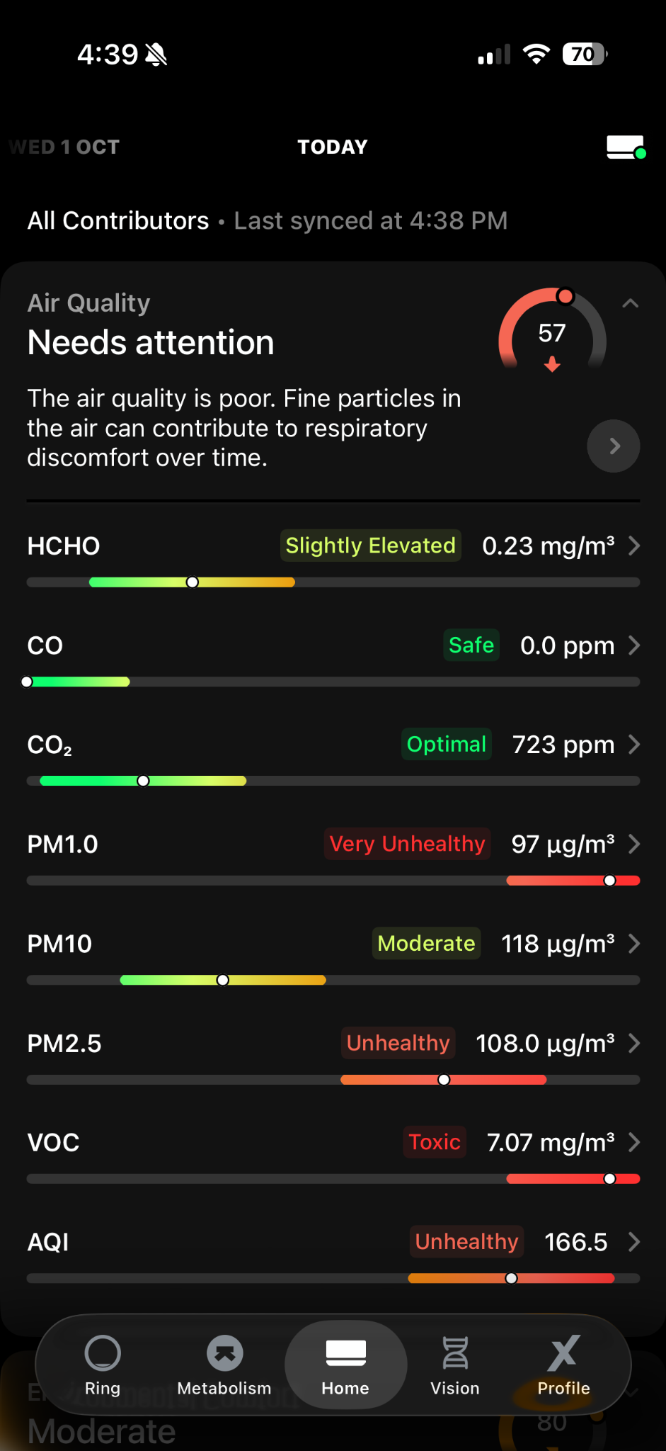 The overall air quality index (AQI 166.5) indicated serious particulate and VOC pollution — the kind that can cause coughing, sinus irritation, or sleep discomfort over time.